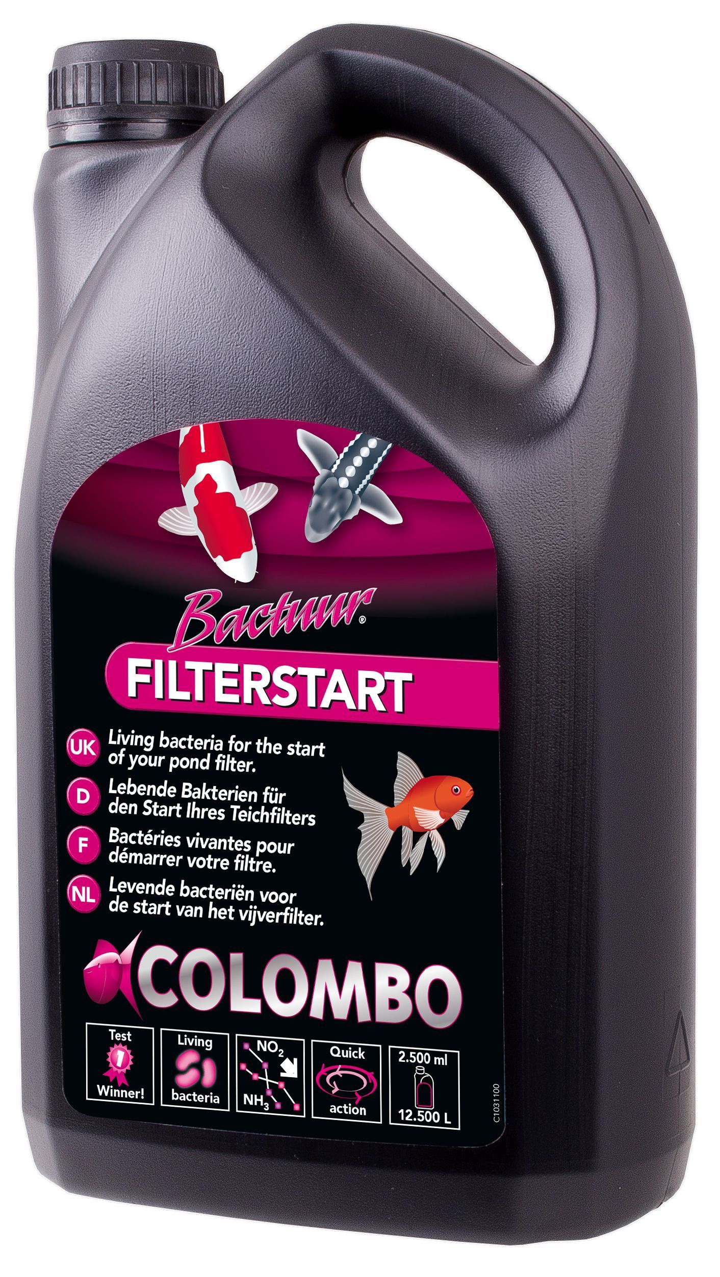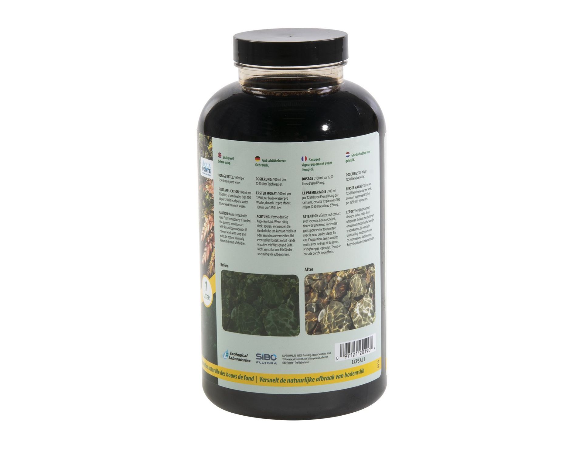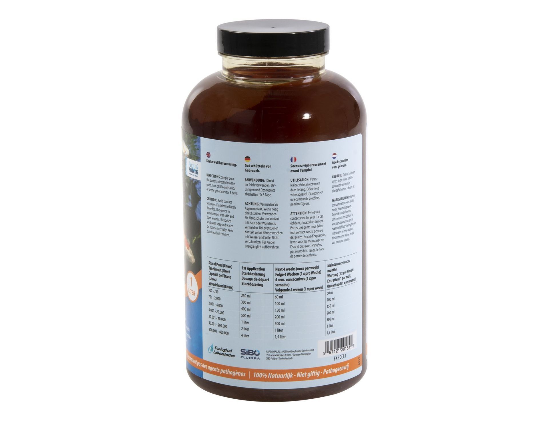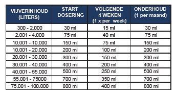 Dosering: Basis dosering = 100ml per 1250 liter vijverwater. Eerste maand 100ml per 1250 liter vijverwater per week, daarna 1 x per maand (indien nodig) 100ml per 1250 liter vijverwater.
